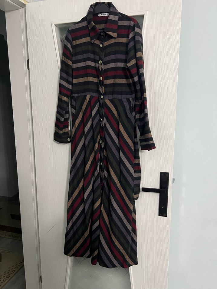 Çok renkli çizgili, düğmeli ve yakalı uzun, bol kesim kadın elbisesi.