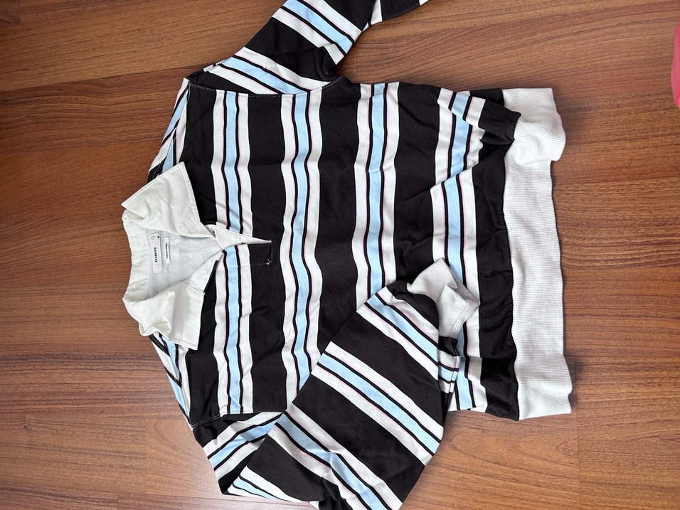 Çok renkli çizgili, uzun kollu, yakalı ve düğmeli detaylı bol kesim polo tişört. Günlük sokak stiline uygun. Sadece kol lastiklerinde leke var görselini paylaştım