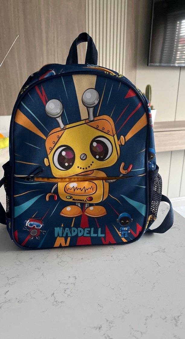 Waddell marka, ön cepleri fermuarlı ve yan file cepleri olan çok renkli çocuk okul çantası, sevimli robot desenlidir. Beslenme çantası da var