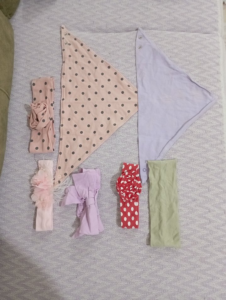 lila renkli bandana da ve yeşil renkli saç bandında leke vardır.diğerlerinde herhangi bir sorun yoktur. 3/10 ay arası kullanılabilirler.