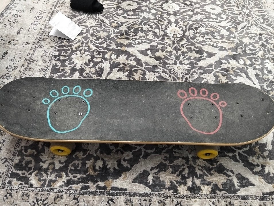 Ayak izi desenli, çok renkli ve koyu tonlu çocuk kaykayı, sarı tekerleklerle donatılmıştır.