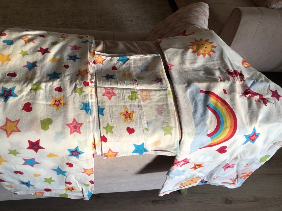 Yumuşak dokulu tekstil malzemeden yapılmış, pastel çok renkli yıldı, kalp, güneş ve gökkuşağı desenli çocuk nevresim takımı.