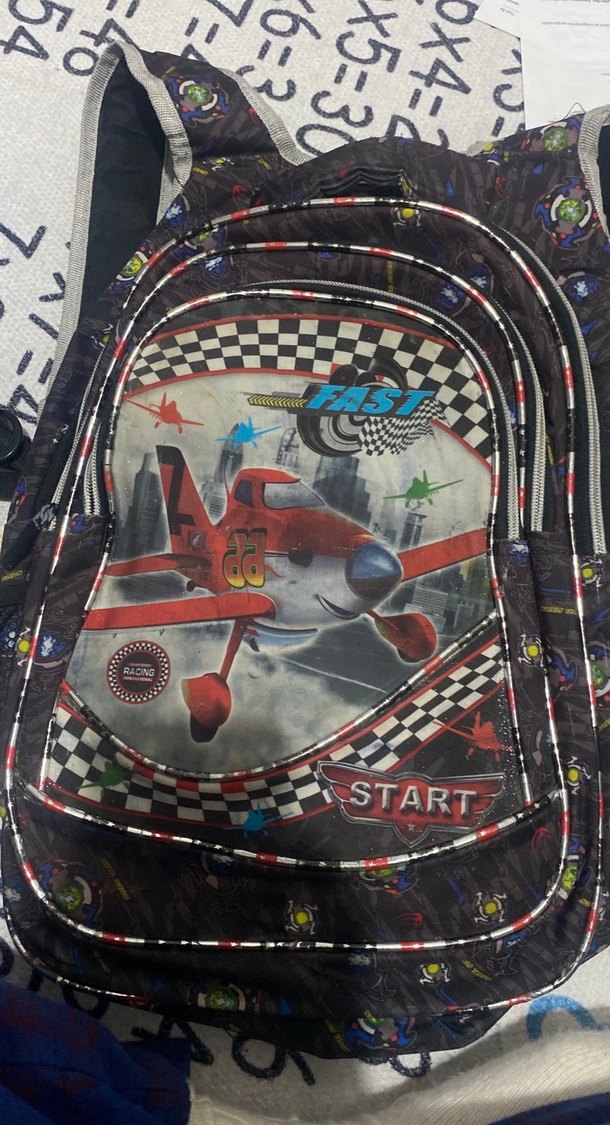 Çocuklar için çok renkli, koyu zemin üzerinde uçak desenli okul çantası. Ön cephesinde 'START' yazısı bulunur, çok bölmelidir. ✈️ Sadece bi fermuarının ucu kopmuştur onun dışında bi kusur yoktur