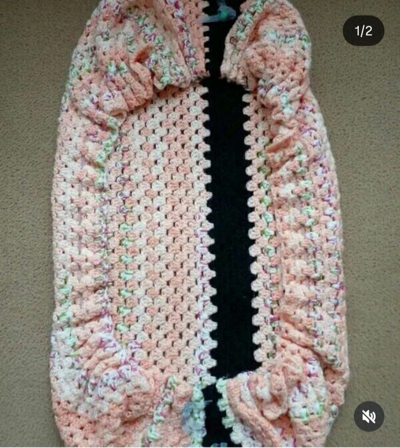 Pastel çok renkli çocuk örgü battaniye, yumuşak örme kumaştan yapılmış olup, narin fırfırlı kenarıyla sıcaklık ve rahatlık sağlar.