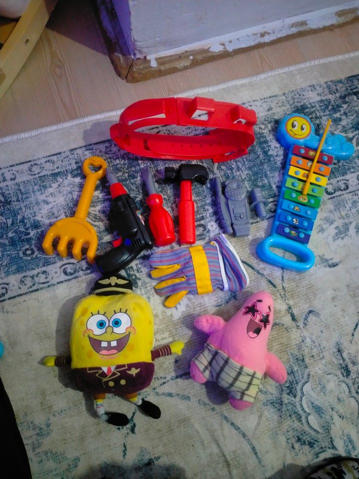 Rengarenk çocuk oyuncak seti; ksilofon, oyuncak aletler, bahçe tırmığı, eldiven ve popüler çizgi film karakterlerine benzeyen peluş oyuncaklar içerir.