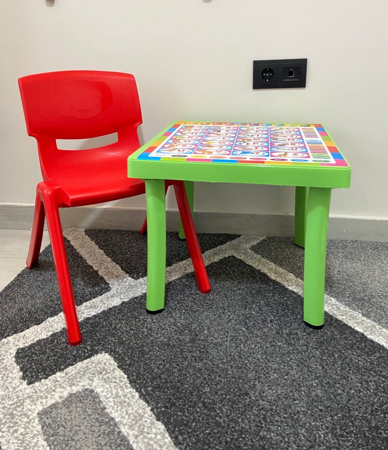 Çocuklar için çok renkli sandalye ve üstü desenli yeşil küçük masa, oyun ve etkinlikler için uygun. Sandalye ve masa hiç kullanılmadı resim çekmek için kurdum tertemiz 1 çizik dahi yok