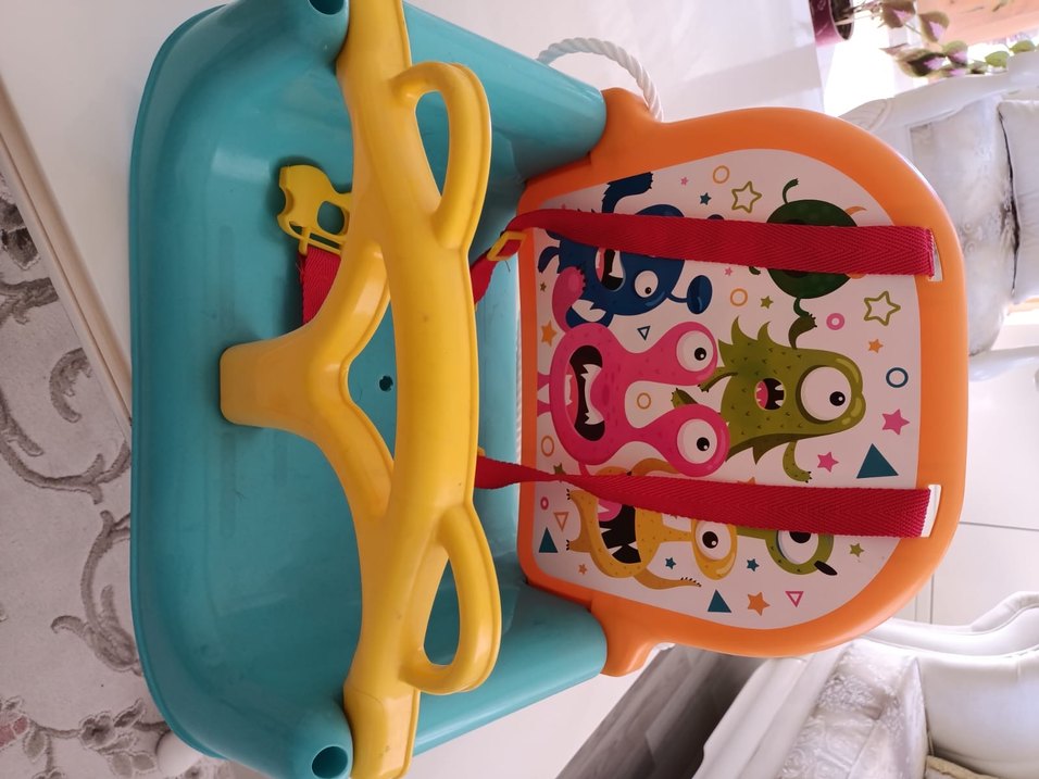 Sarı tutamaçlı, canlı renkli ve eğlenceli canavar desenli oturağı olan çocuk scooter'ı. Kırmızı emniyet kemerleri bulunur.