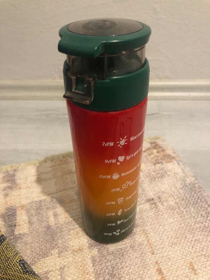 Çocuklar için çok renkli termos şişesi, güvenli açılır kapak ve zaman işaretleri ile kolay kullanım sunar. Koyu yeşil ve kırmızı renkler dikkat çeker.