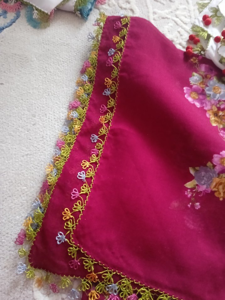 Bu kadın yazma çok renkli tekstil ve narin dantel kenarlarıyla dikkat çeker. Bohem ve retro tarzda, renkli çiçek detayları içerir.