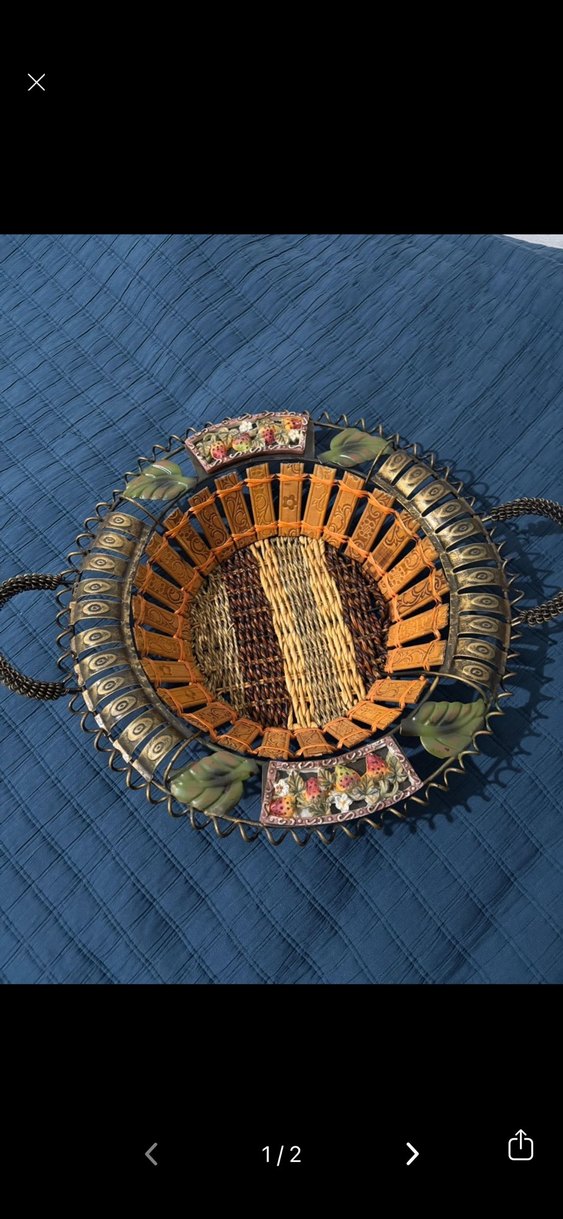 Çok renkli ve koyu tonlarda, dokuma ve oyma detaylara sahip dekoratif sepet. Çiçek desenleri ve metal saplar içerir.