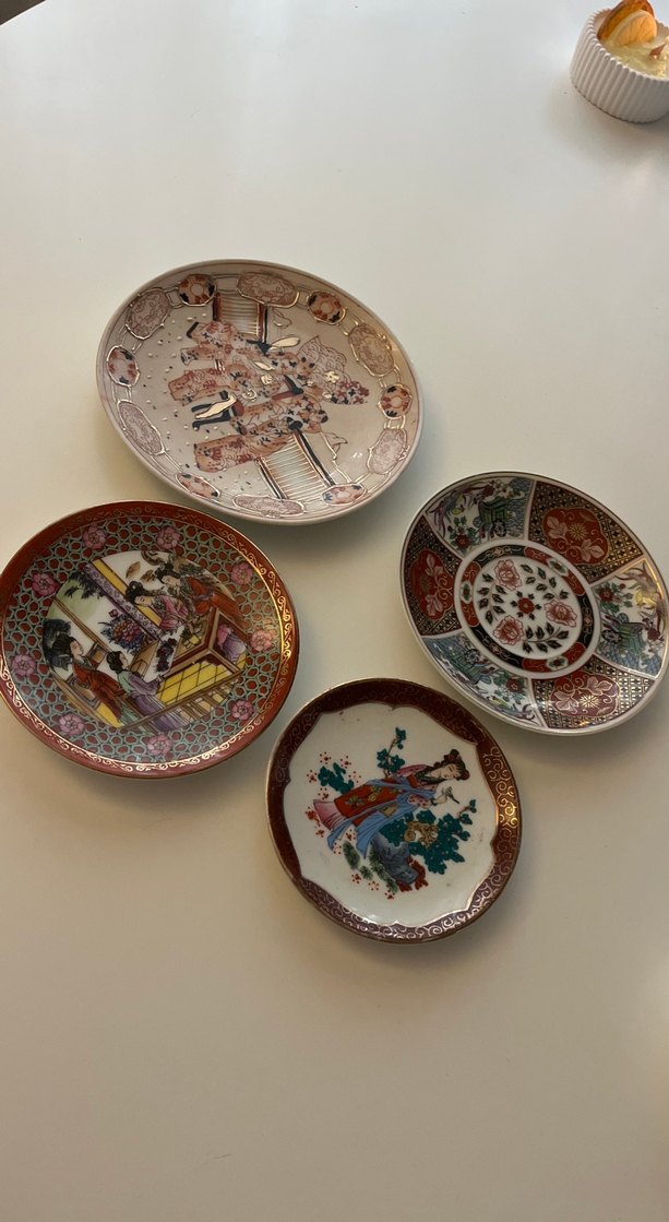 Koyu ve canlı renklerde geleneksel desenlere sahip dört parçalık dekoratif seramik tabak seti. ️