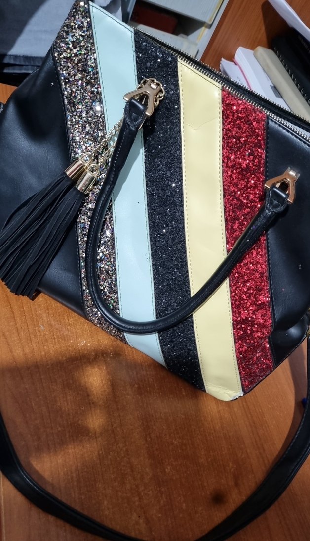 Püsküllü detaylı, parlak çok renkli deri kadın çantası. Baskılı deseni ve sokak stili görünümüyle günlük kullanıma uygundur. muhteşem içi dışı görsellerde mevcut