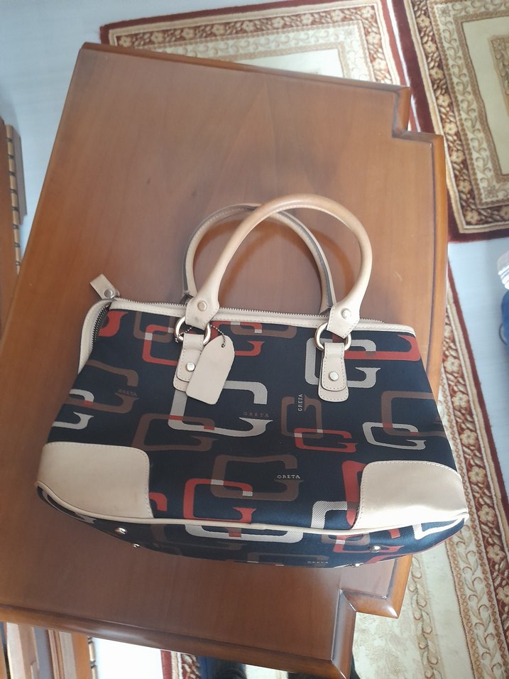 Deri, baskılı desenli ve tokalı saplara sahip kadın çantası. Günlük kullanım için çağdaş, trend ve iş stilini bir araya getirir. Gri ve çok renkli detaylar içerir.