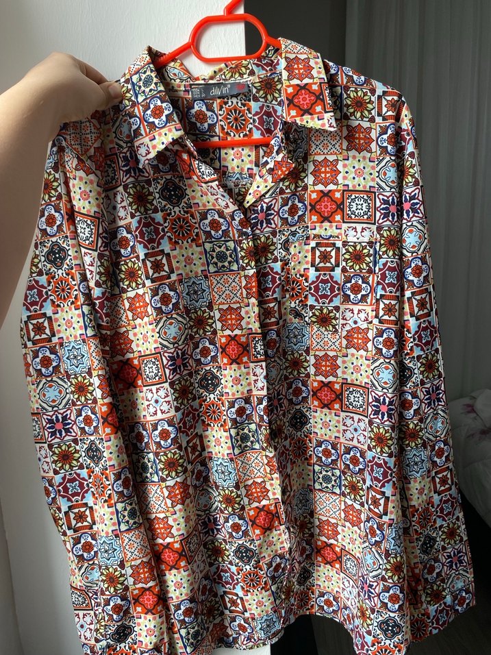 Bohem tarzda, düğmeli ve çok renkli desenlere sahip, uzun kollu, yakalı ve bol kesim kadın gömleği. Rahat ve renkli bir günlük kullanım ürünü.
