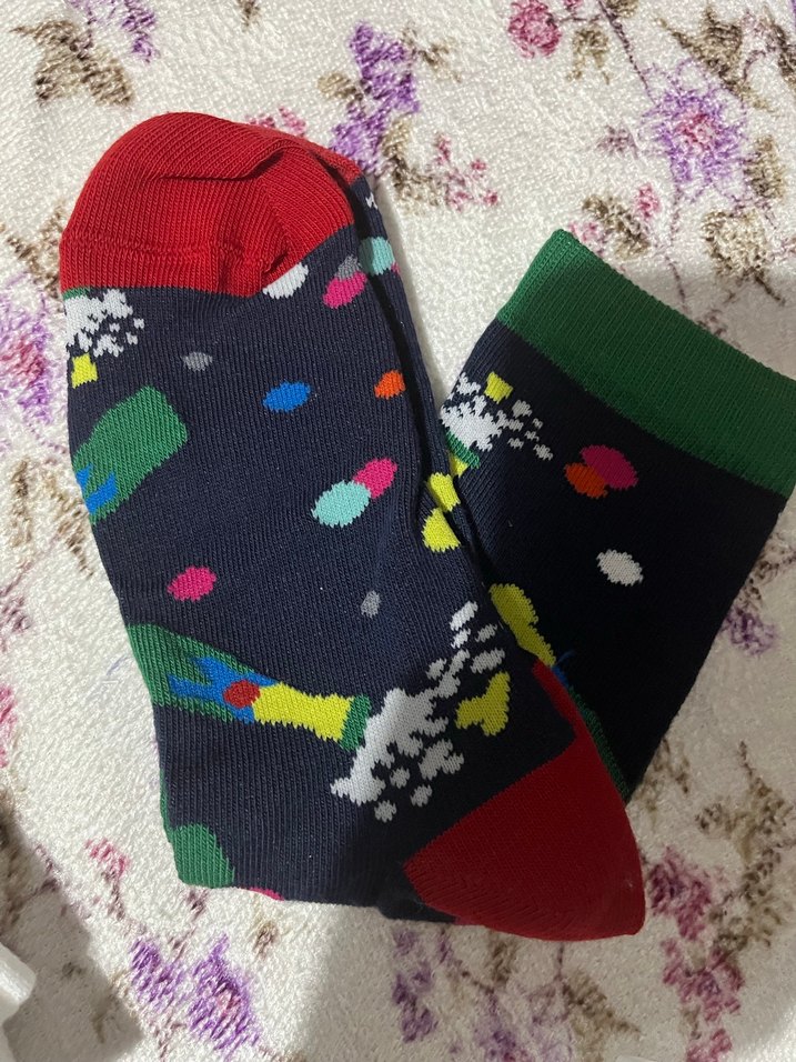 Yumuşak örme kumaştan yapılmış, çok renkli ve desenli çorab. Kırmızı burun ve yeşil manşetlere sahiptir.