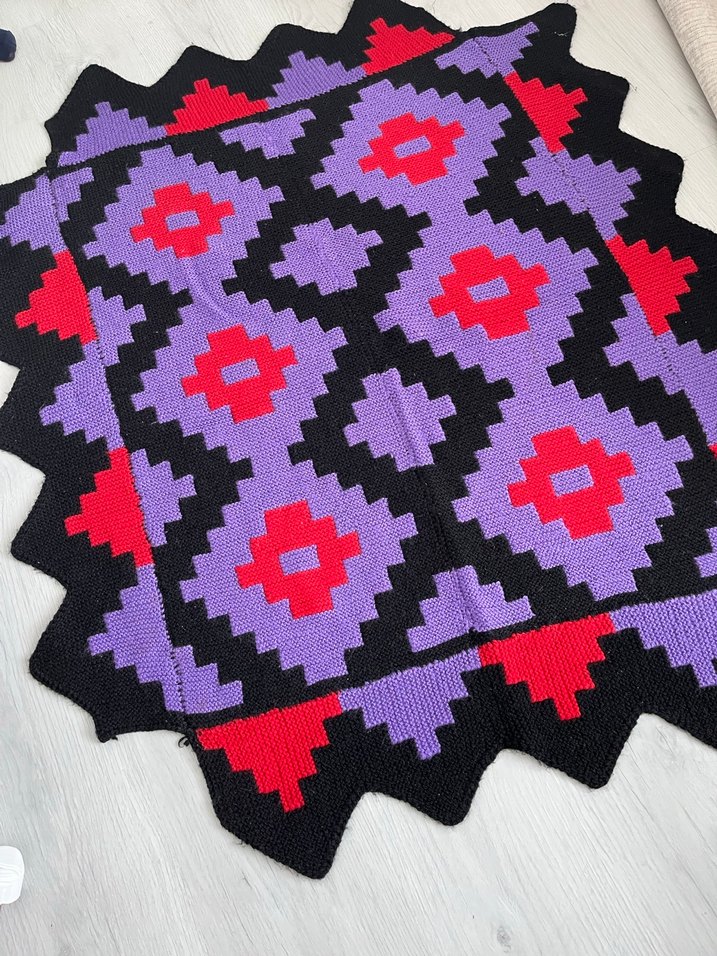 Koyu renklerde siyah, mor ve kırmızı içeren çok renkli desenli el örgüsü kilim, zikzak kenar tasarımına sahiptir. ️