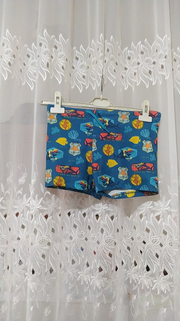 Çok renkli desenli erkek çocuk mayo, kısa kesim ve yumuşak kumaş ile rahat kullanım sağlar.