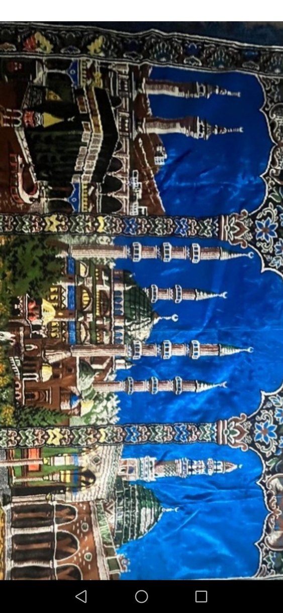 Bu geleneksel halı, çok renkli desenlere ve koyu mavi zemin üzerine mimari öğeleri andıran motiflere sahiptir. Klasik bir dokunuş sunar. ️almanyadan geldi çok az duvarda kaldı yeni gibi