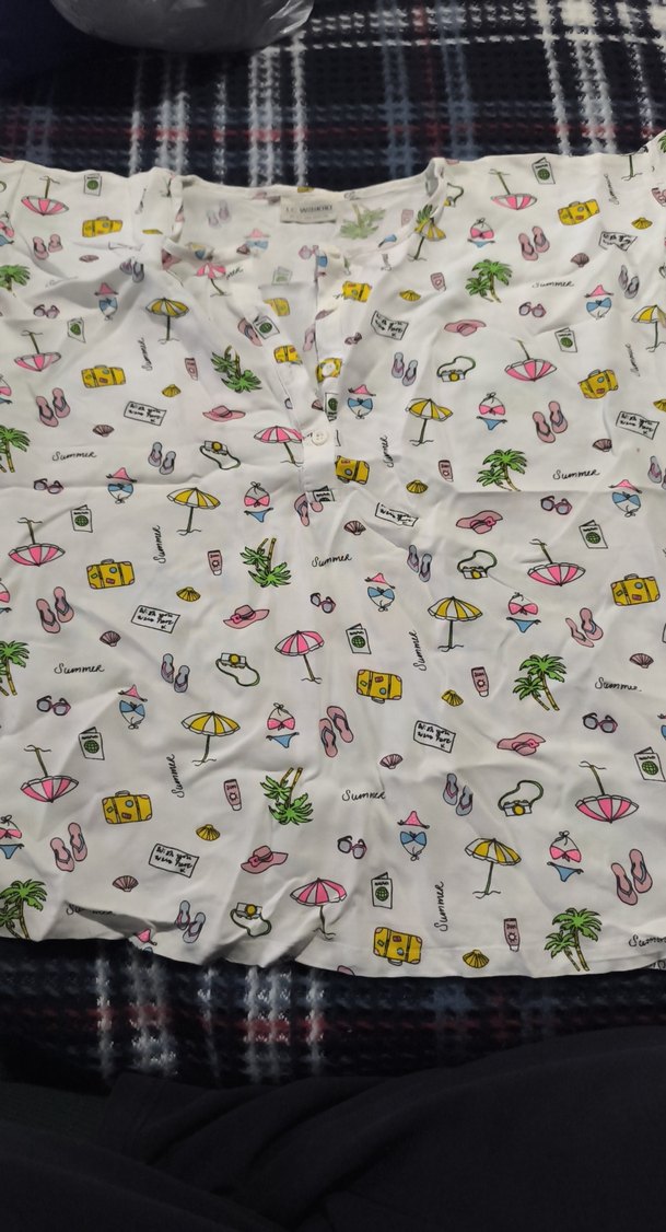 Çok renkli, desenli, kısa kollu ve önden düğme detaylı kız çocuk gömlek. 0 ayarında, temiz kullanılmıştır. 10-11 yaş, 140-146 cm.