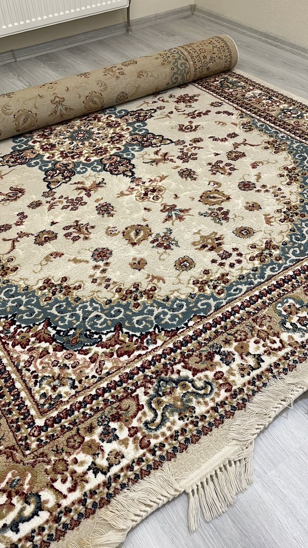 Hafif tonlarda çok renkli, desenli klasik tarzda, çiçek motifleri ve detaylı bordürlü bir halı.