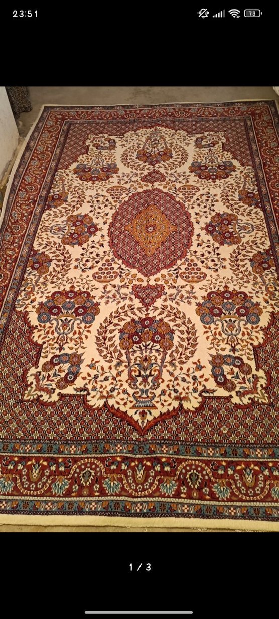 Çok renkli, koyu tonlarda desenli klasik halı, çiçek motifleri ve ortasında madalyon deseni bulunur.