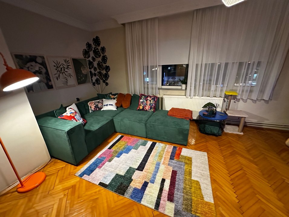 Bu modern halı, soyut geometrik şekillerle odanıza canlılık katıyor.