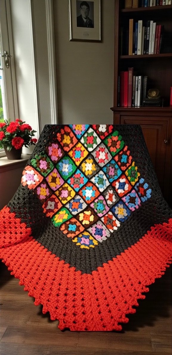 Koyu tonlarda, çok renkli kare desenlere sahip örgü battaniye, sıcaklık ve renk katar.