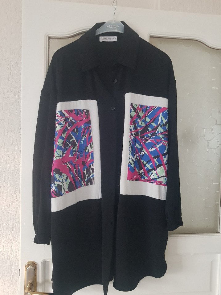 Kadın gömlek, uzun kollu ve düğmeli, bol kesimdir. Koyu renkte olup önünde çok renkli canlı desenli paneller bulunur. Uzun boyu ve kesimiyle sokak stiline uygundur. kolları lastiklidir.Bir kere giyildi .Hata kusur yok