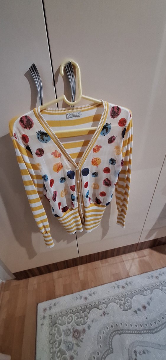 Düğmeli, uzun kollu, V yakalı, çok renkli baskılı triko hırka. Fitted kesim ve midi boyda, günlük rahat stil için uygun.