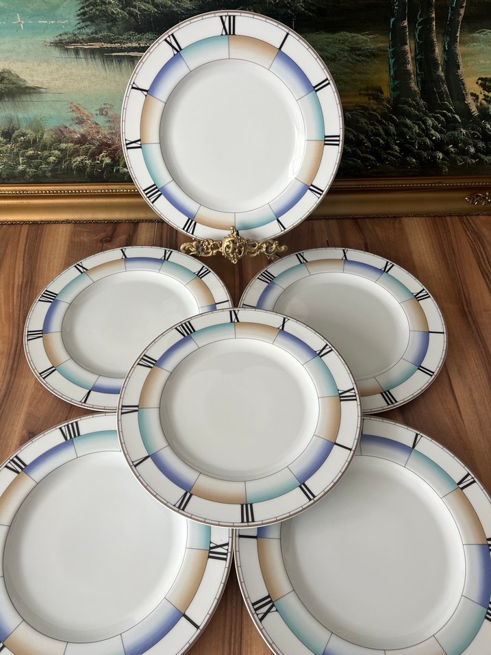 Çok renkli kenarları Roma rakamlarıyla süslenmiş, açık renkli yemek tabağı seti. Çeşitli yemek ortamları için uygundur orjinal damgaya sahip