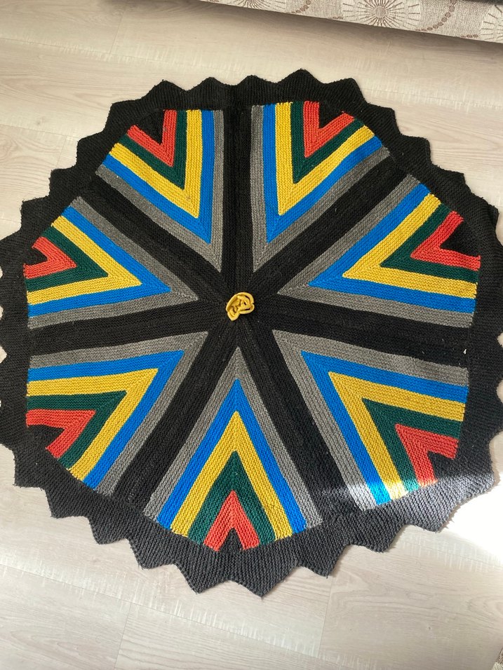 Yuvarlak paspas, koyu çok renkli geometrik desenlere sahip, odalara özgün bir karşı kültür stili katıyor.
