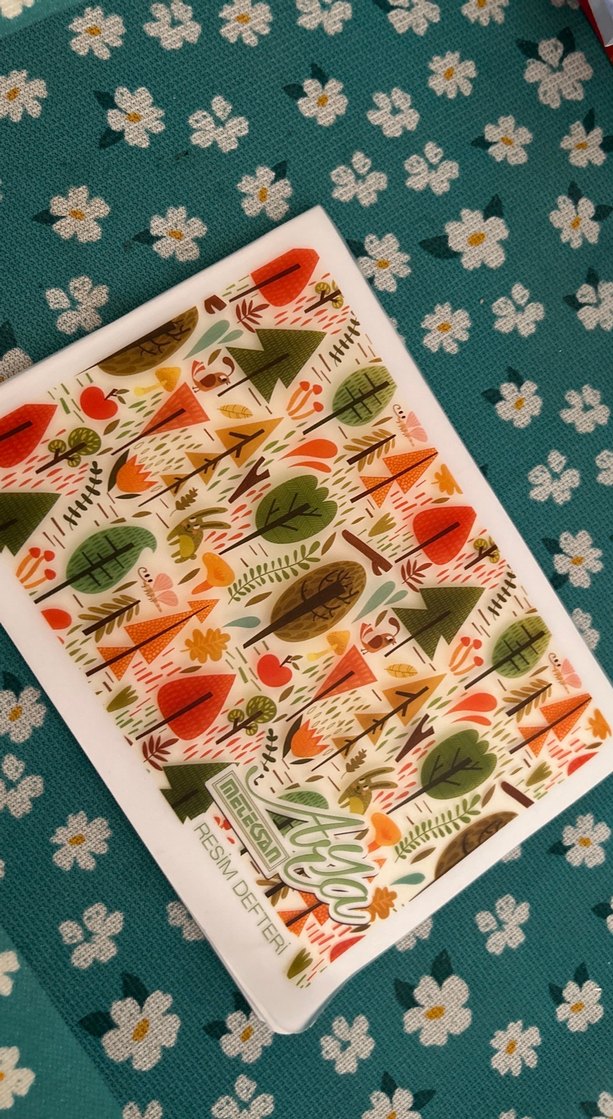 Çok renkli doğa temalı kapak üzerinde ağaç ve yaprak desenleri bulunan, çizim için uygun hafif bir resim defteridir. ️