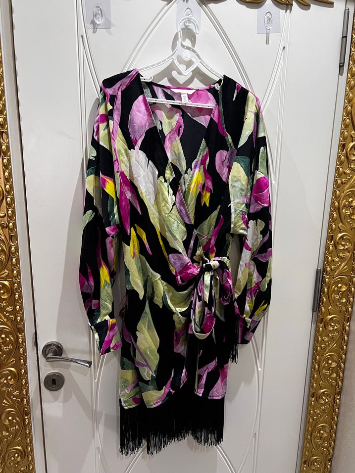 Kadınlar için çok renkli desenli, uzun kollu, drapeli ve V yaka kısa uzunlukta elbise. Ütülenip gönderim sağlanacaktır.