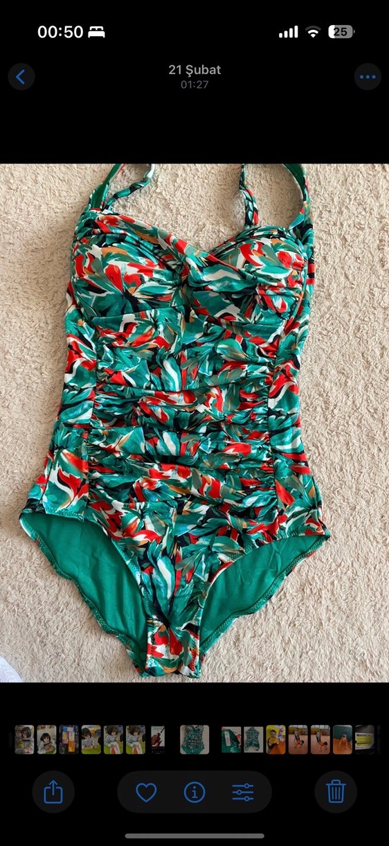 Kadınlar için çok renkli, koyu tonlarda tie-dye desenli, drapeli ve askılı kısa mayo. Bohem ve retro tarzıyla plajda kullanıma uygun.