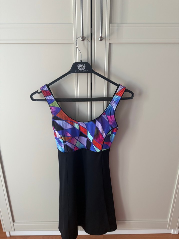 Kadınlar için uzun kesim, çok renkli tie-dye desenli ve drapeli spor mayo. Üst kısmı desenli, alt kısmı koyu renk ve sıkı kesimlidir. ♀️