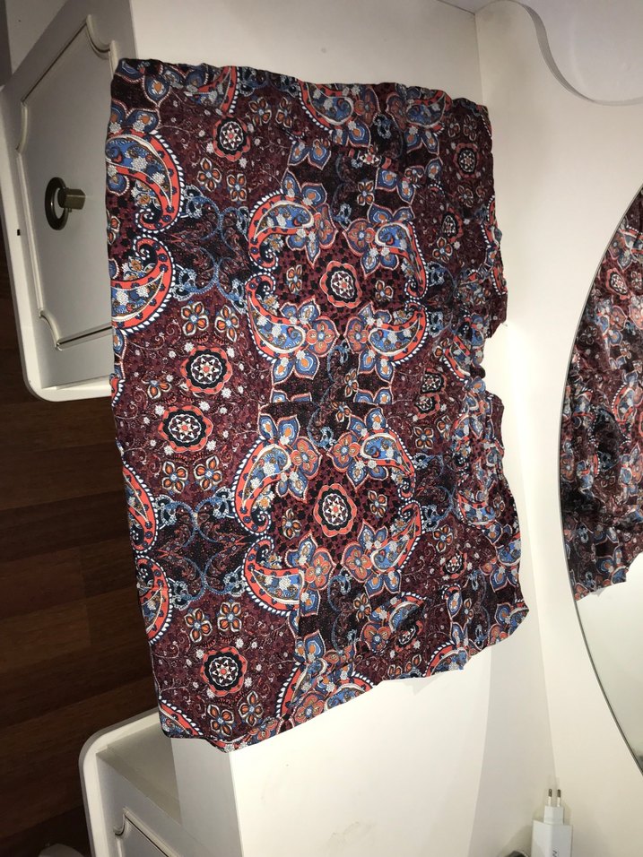Yumuşak dokulu, çok renkli bağlama desenli, düğmeli, bol kesim hamile eteği. Günlük kullanım için bohem tarzda midi boy.
