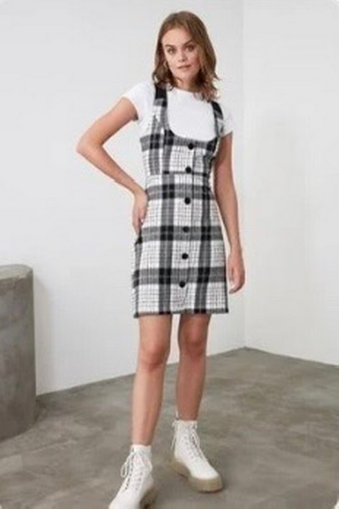 Çok renkli Düğmeli Ekoseli jile kareli Mini Elbise salopet