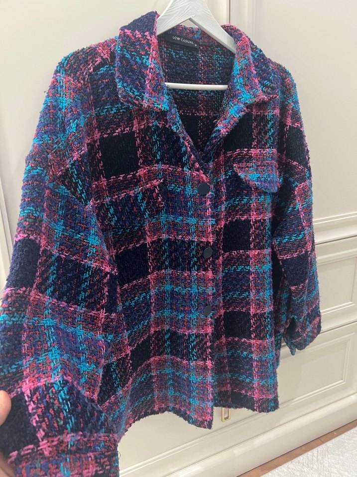 Uzun kollu, çok renkli düğmeli kadın gömlek. Bol kesim ve notched lapel yaka ile günlük sokak tarzına uygun rahat bir model.