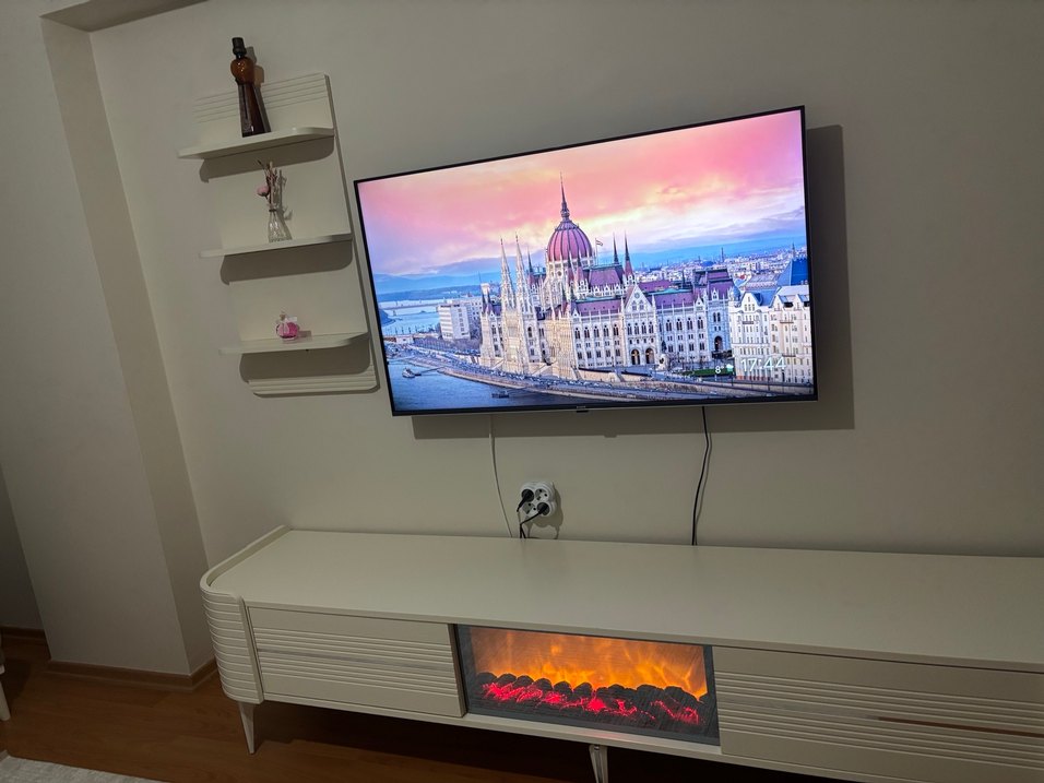Duvara monte edilmiş, çok renkli canlı görüntülere sahip Tv ünitesi , beyaz medya ünitesi ve elektrikli şömine üzerinde yer alıyor.Herhangi bir yıpranma çizilme ya da bir zarar görme durumu yoktur.