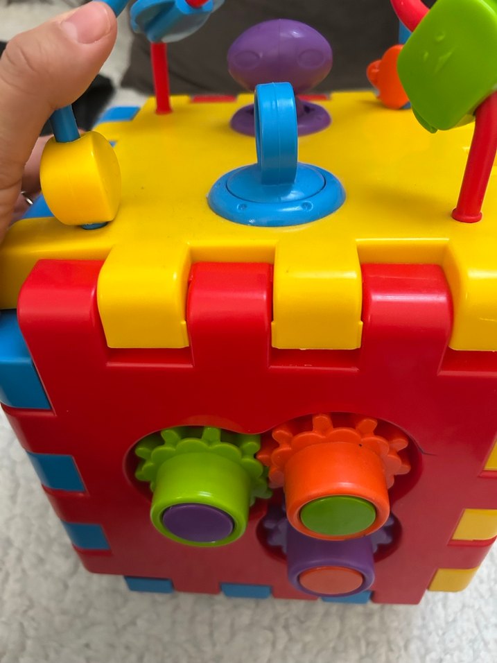 Bu çok renkli eğitici küp, dişliler ve şekiller gibi çeşitli etkileşimli parçalarla çocukların oyunla öğrenmesini sağlar. Kırığı yok sadece dolapta durduğu için tozlanmış. Yıkanırsa yenisinden daha yeni bir oyuncak :)