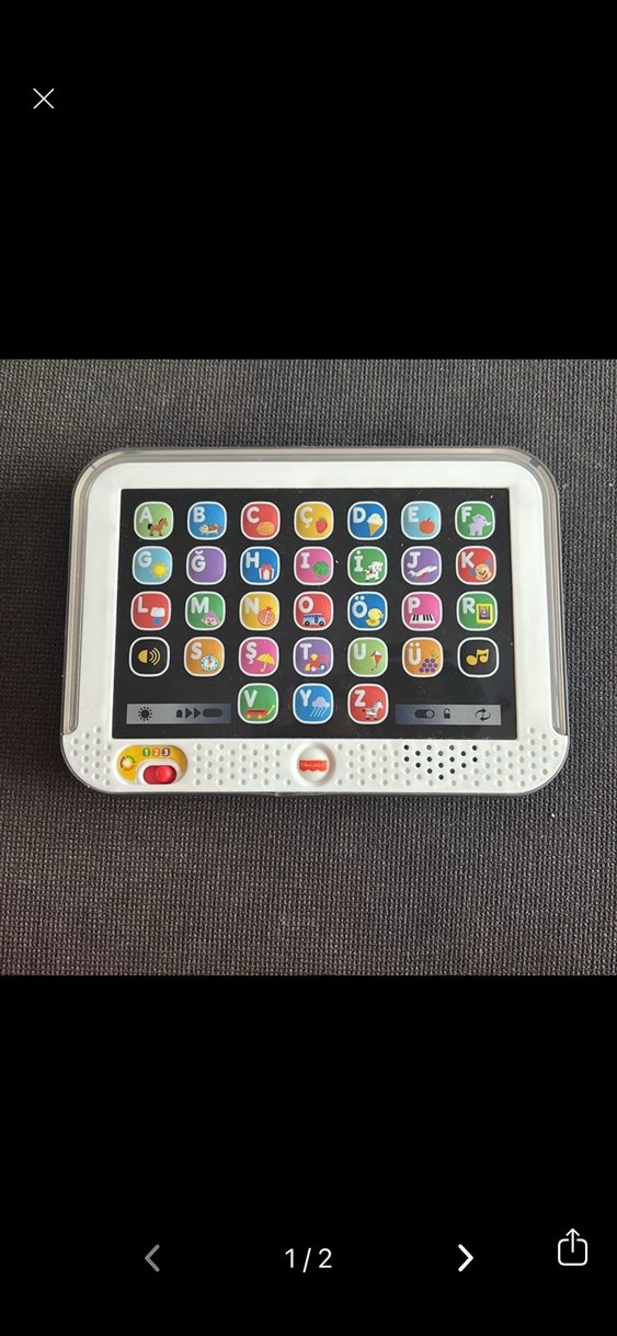 Gri çerçeveli, renkli alfabe tuşları olan eğitici oyuncak. Harfleri ve sesleri öğretmek için ses kontrolü ve etkileşimli düğmeler içerir. Oğlum büyüdüğü için kullanmıyor. Sorunsuz çalışıyor.