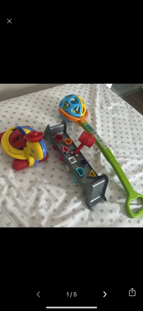 Çeşitli şekiller ve etkileşimli parçalar içeren çok renkli eğitici çocuk oyuncakları. Kolay oyun için saplı top ve şekil ayırıcı içerir.