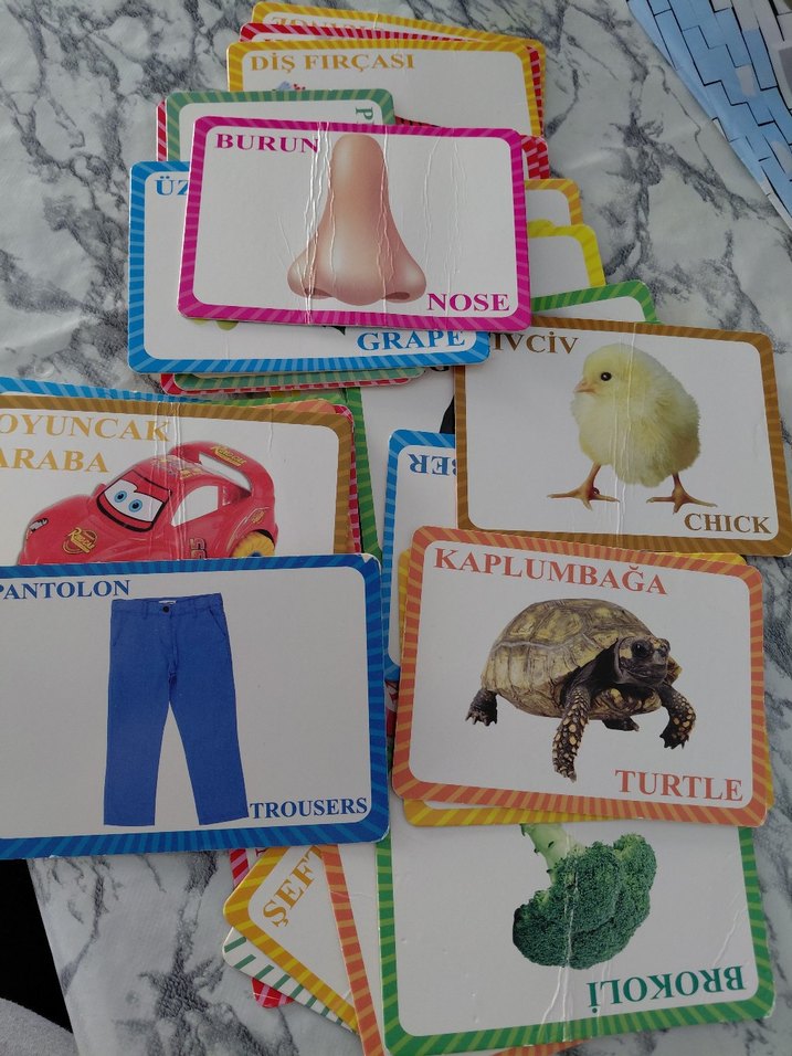 Çok renkli eğitici kartlar, Türkçe ve İngilizce kelimelerle nesne ve hayvanları tanıtarak öğrenmeyi destekler.