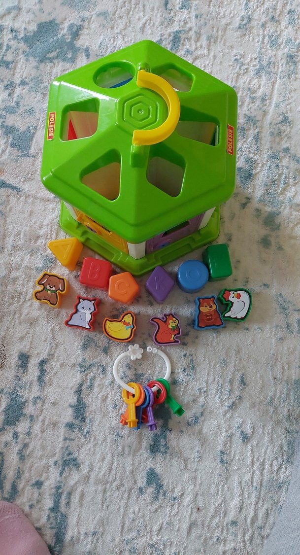 Çeşitli şekilli bloklar, hayvan figürleri ve renkli anahtarlar içeren çok renkli yeşil eğitici oyuncak. Öğrenme ve oyun için uygundur.