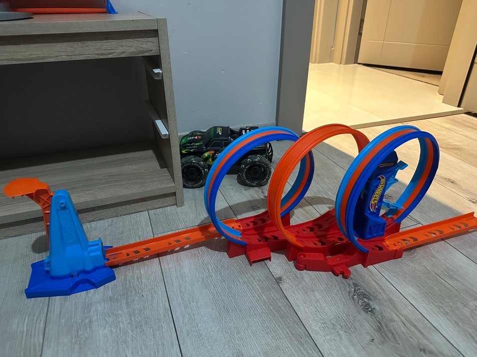 Çok renkli eğitici oyuncak yarış seti, döngülü pistler ve canavar kamyon içerir, etkileşimli oyun ve öğrenme sağlar.