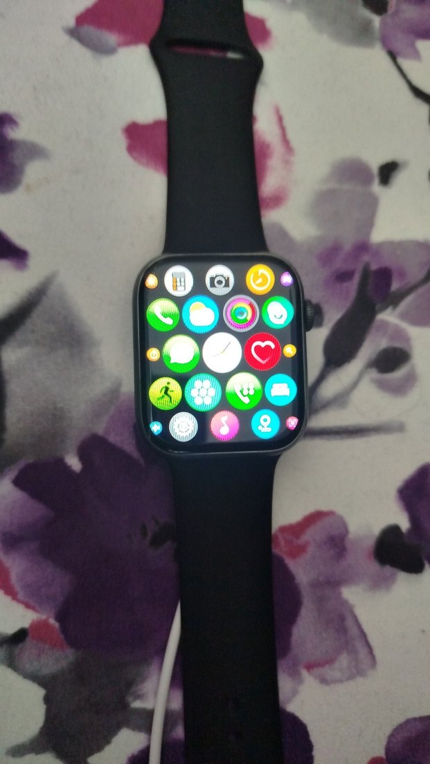 Çok renkli ekranı ve koyu renk kayışıyla çeşitli uygulama simgeleri bulunan akıllı saat. ⌚ şarj aleti vardır kırık çatlak yoktur şarj iyi gidiyor dur
