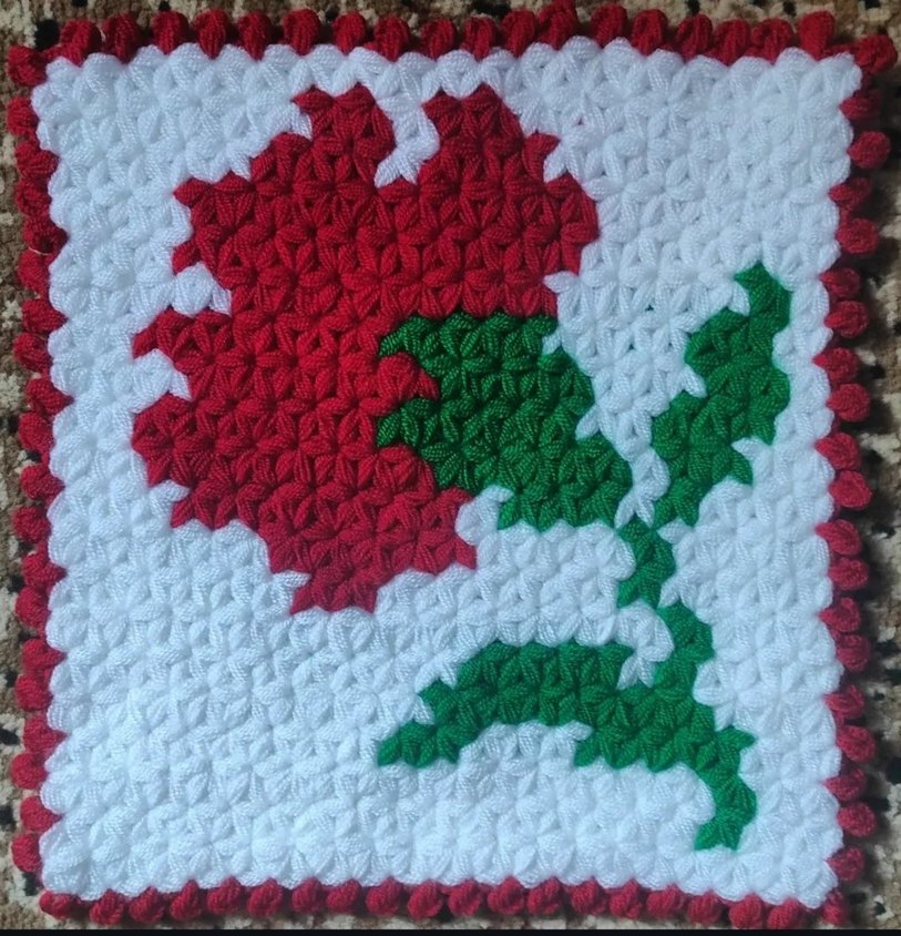 Kırmızı, yeşil ve beyaz renklerde çiçek desenli, yumuşak dokulu el örgüsü çeyizlik lif.