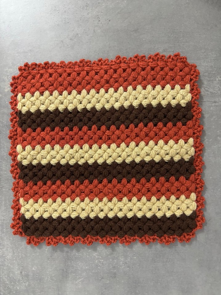 El örgüsü, koyu tonlarda çok renkli çizgili, dokulu örme desene sahip banyo süngeri.