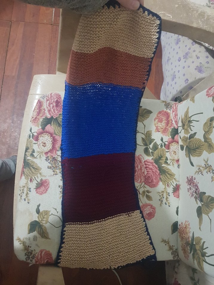 bej, kiremit, mavi ve bordo renklerinde geniş yatay şeritlerle koyu çok renkli tasarıma sahiptir. Yumuşak örgü dokusuyla rahat kullanım sunar. banyo lifi uzun