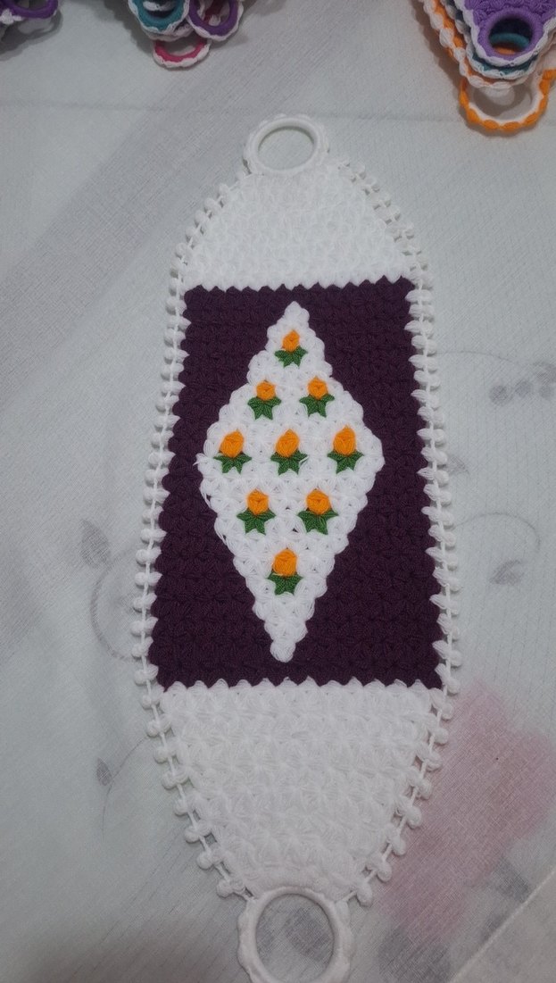 El yapımı çok renkli banyo süngeri, beyaz zemin, koyu mor merkez ve turuncu-yeşil çiçek detaylarına sahiptir. Askı halkalıdır.